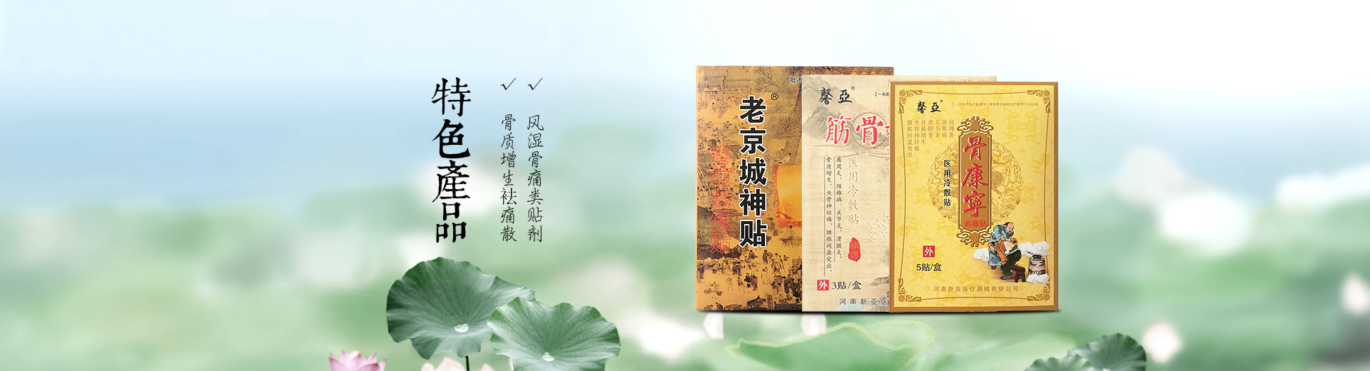公司主要從事貼劑、膏藥、粉劑及醫(yī)療衛(wèi)生材料等多種劑型生產(chǎn)銷售。主導產(chǎn)品有:骨質(zhì)增生袪痛貼、肩周炎一貼靈、安痛貼[系列]、偏癱威靈貼、腳氣百分百、兩面針抗菌液、痛經(jīng)百消貼、乳腺增生百消貼、無痕燒傷膏、等二十多個產(chǎn)品。